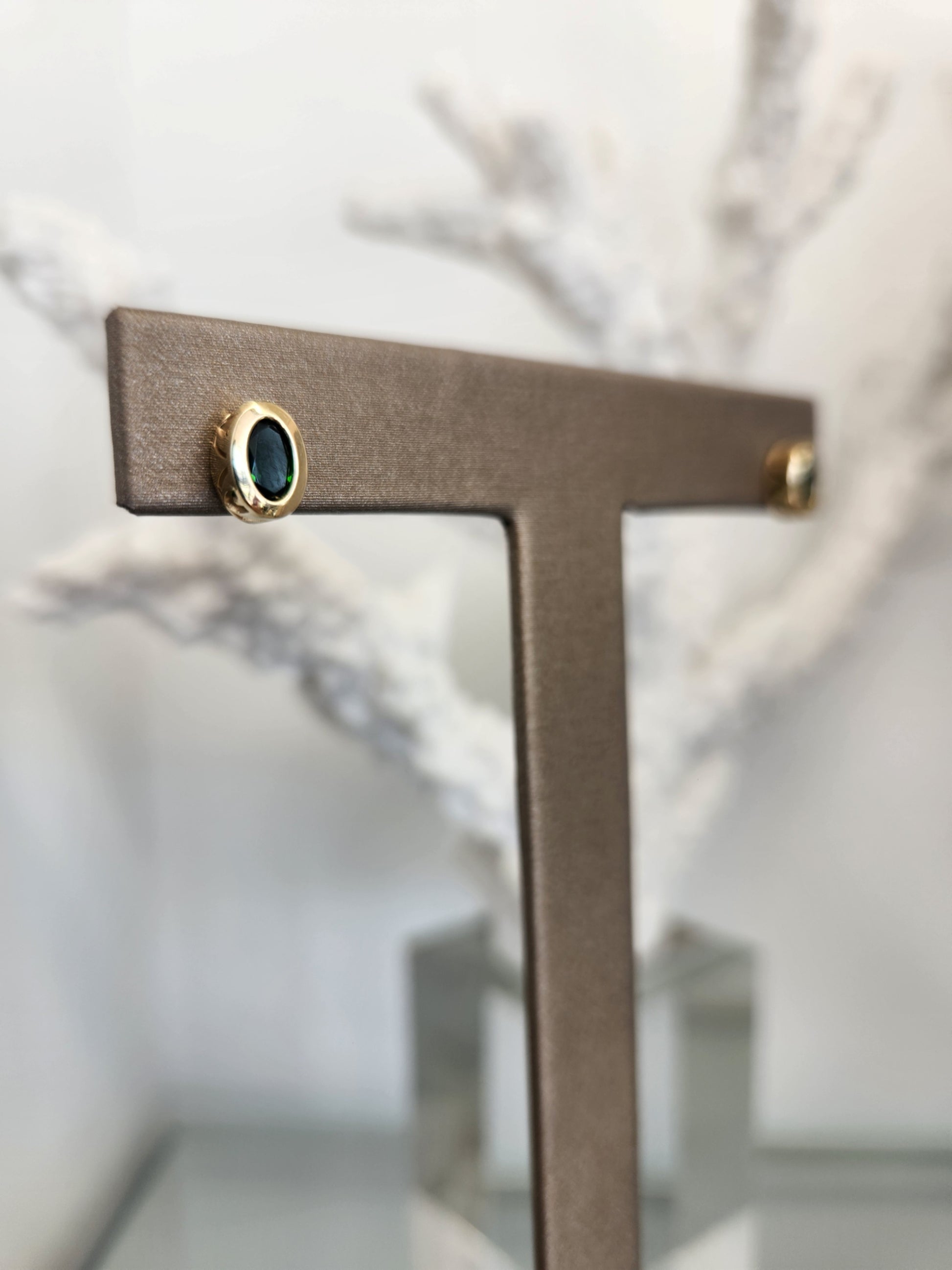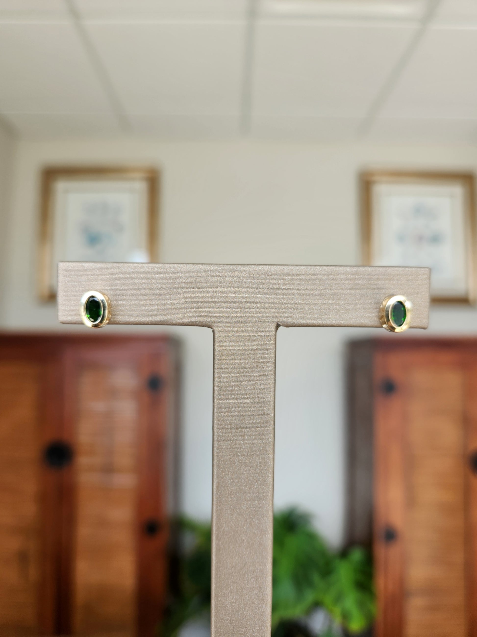 14 Karat Yellow Gold Oval Green Chrome Diopside Bezel Set Stud Earrings