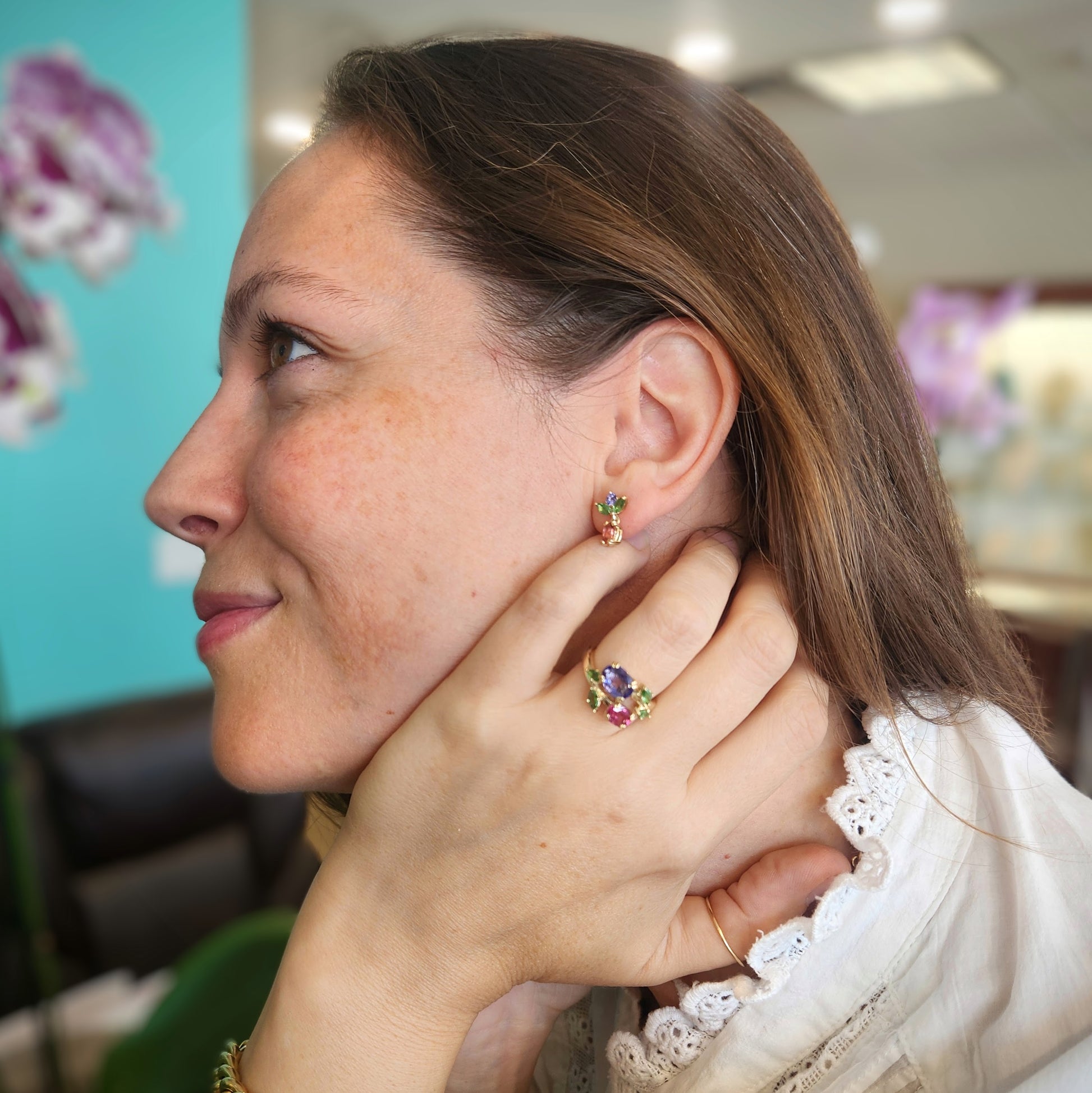 Get ready for the sweetest floral inspired gemstone earrings! Colorful Tanzanite, Tourmaline & Tsavorite blossom on your ears as they light up your beautful face.