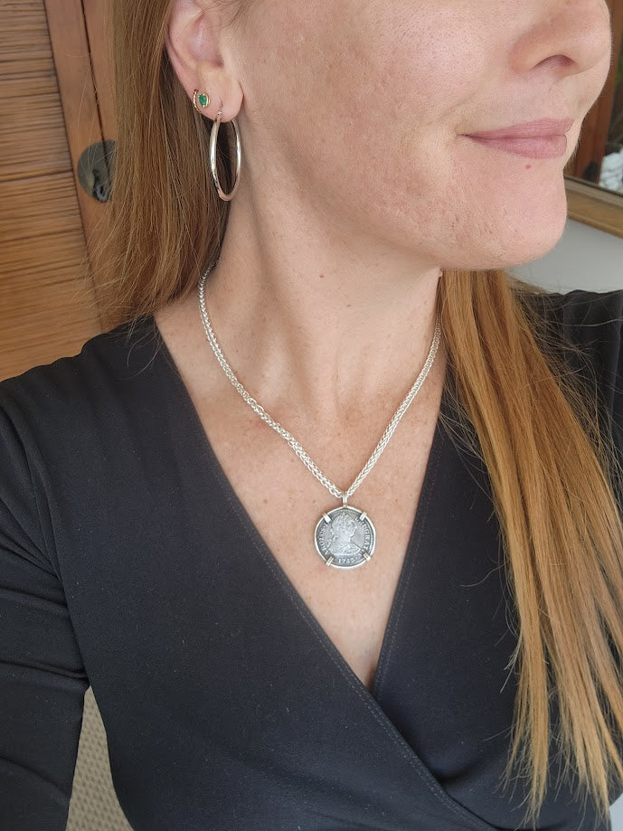 Sterling Silver Carlos II 2 Reales Coin Set In Prong Set Silver Bezel Pendant