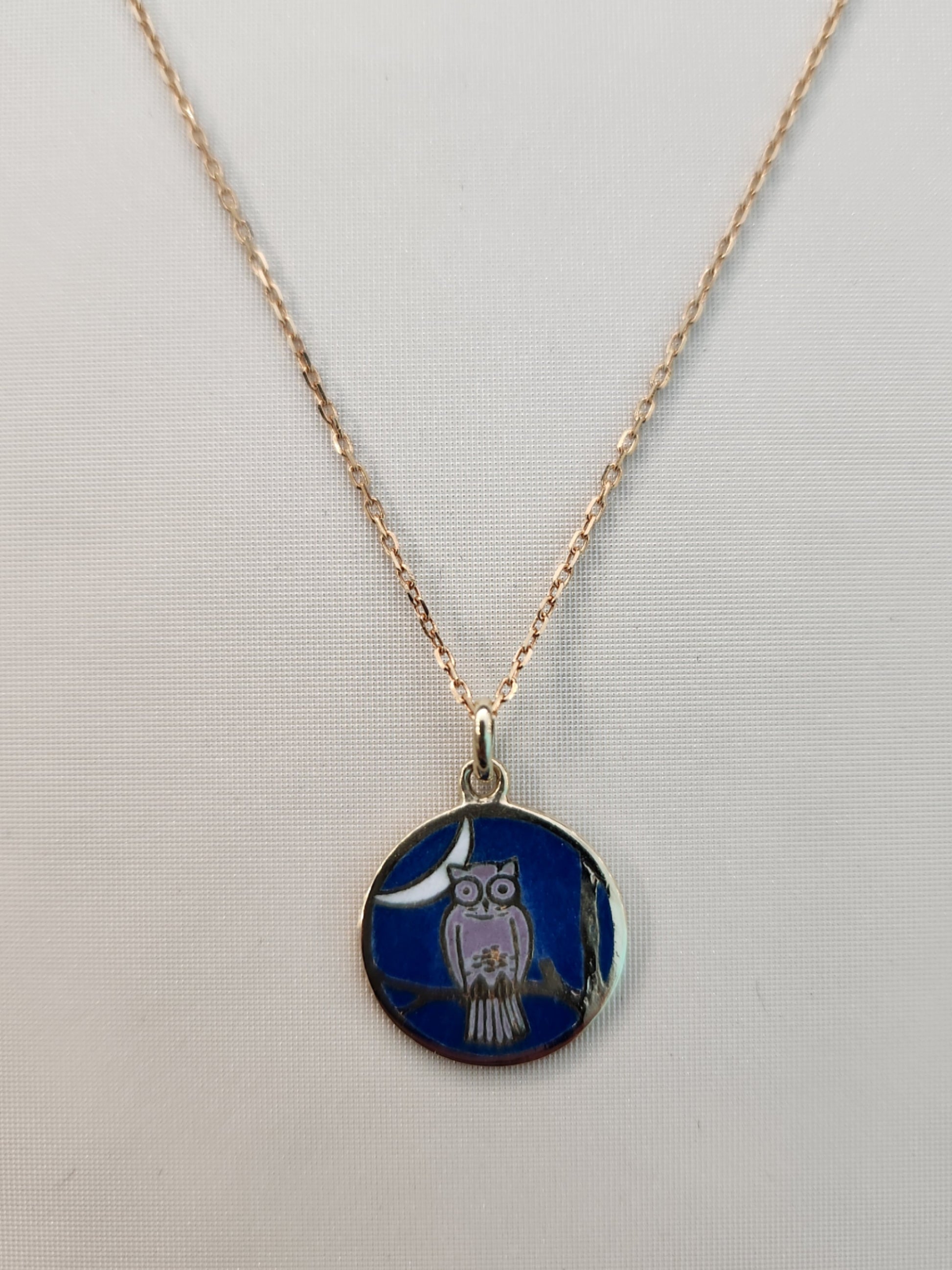 Vintage 14 Karat Yellow Gold 14 Mm French Enamel Owl & Moon Disc Charm