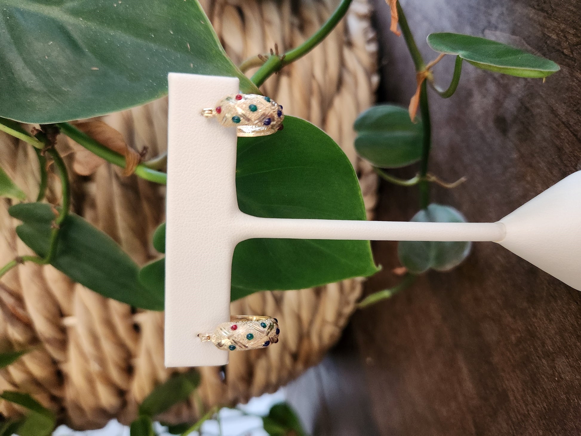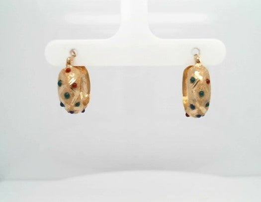 Vintage 14 Karat Yellow Gold Etched Hoop Earrings With Red, Blue & Green Enamel Accents