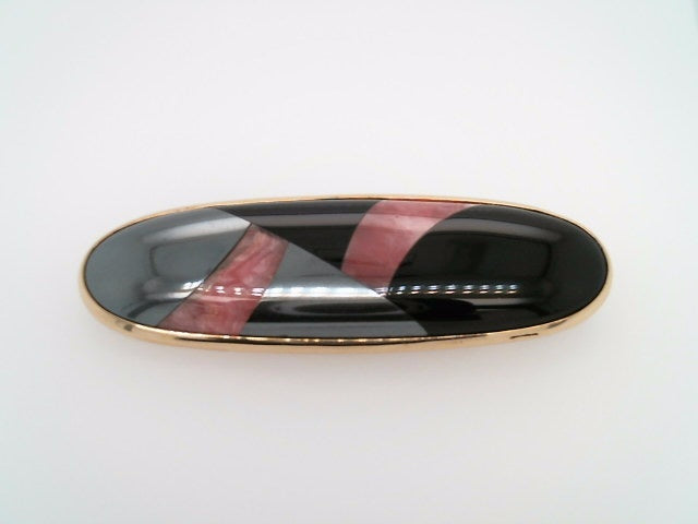 Vintage 14 Karat Yellow Gold Rhodochrosite, Black Onyx, & Hematite Mosaic Gemstone Pin